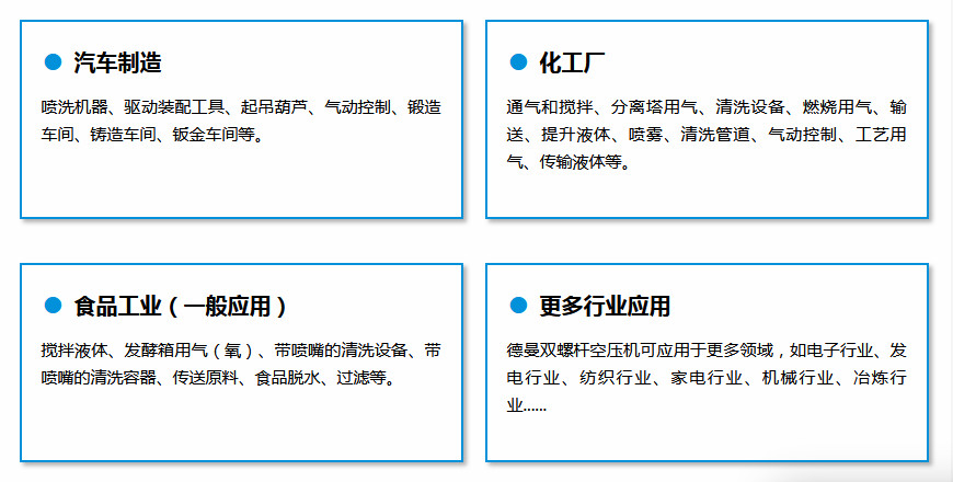 德曼压缩机集空气压缩机科研开发、生产制造、销售服务于一体,长期服务机械、印刷、化工、电力、食品、医药、纺织、仪表、电子等行业。